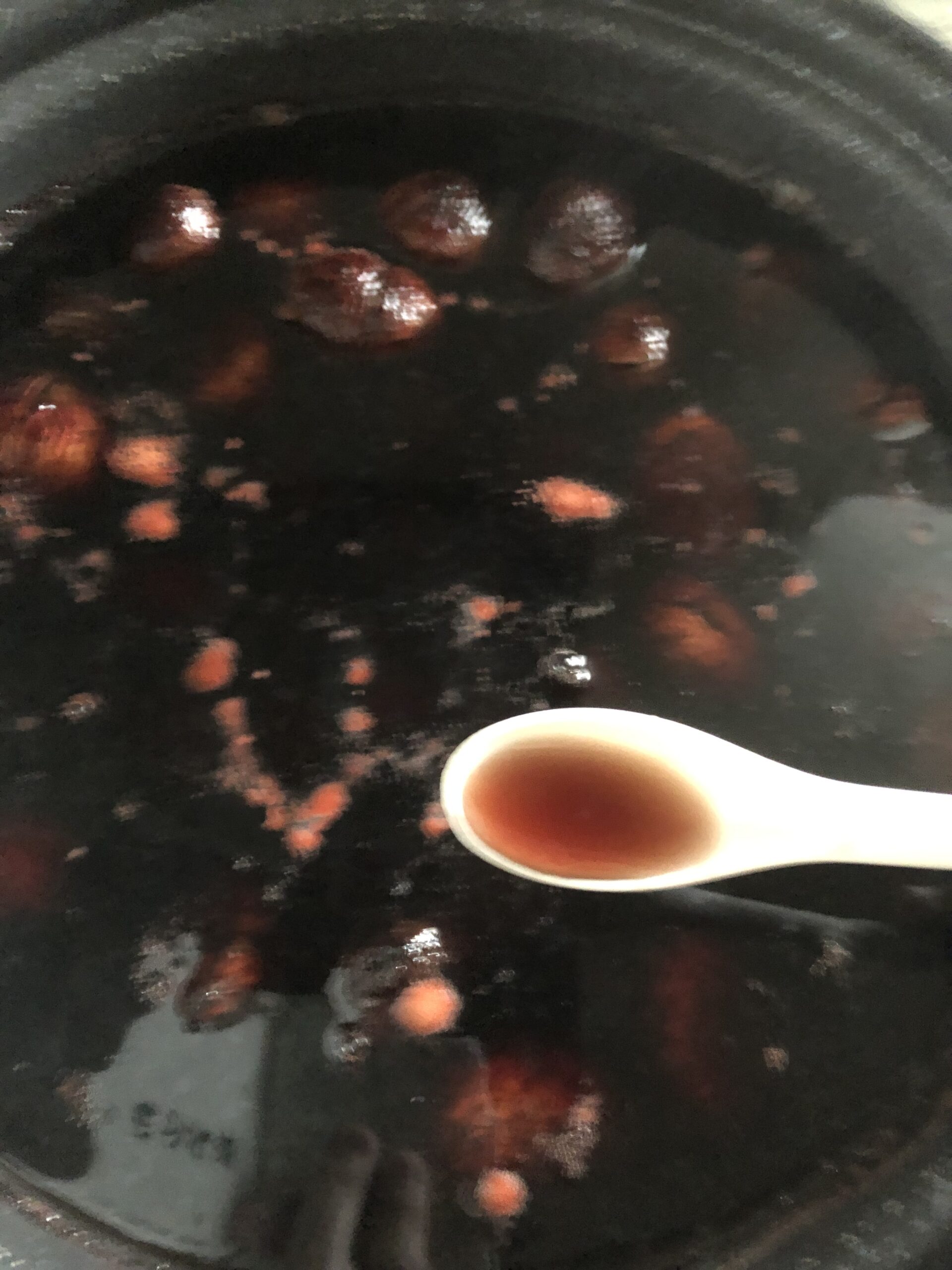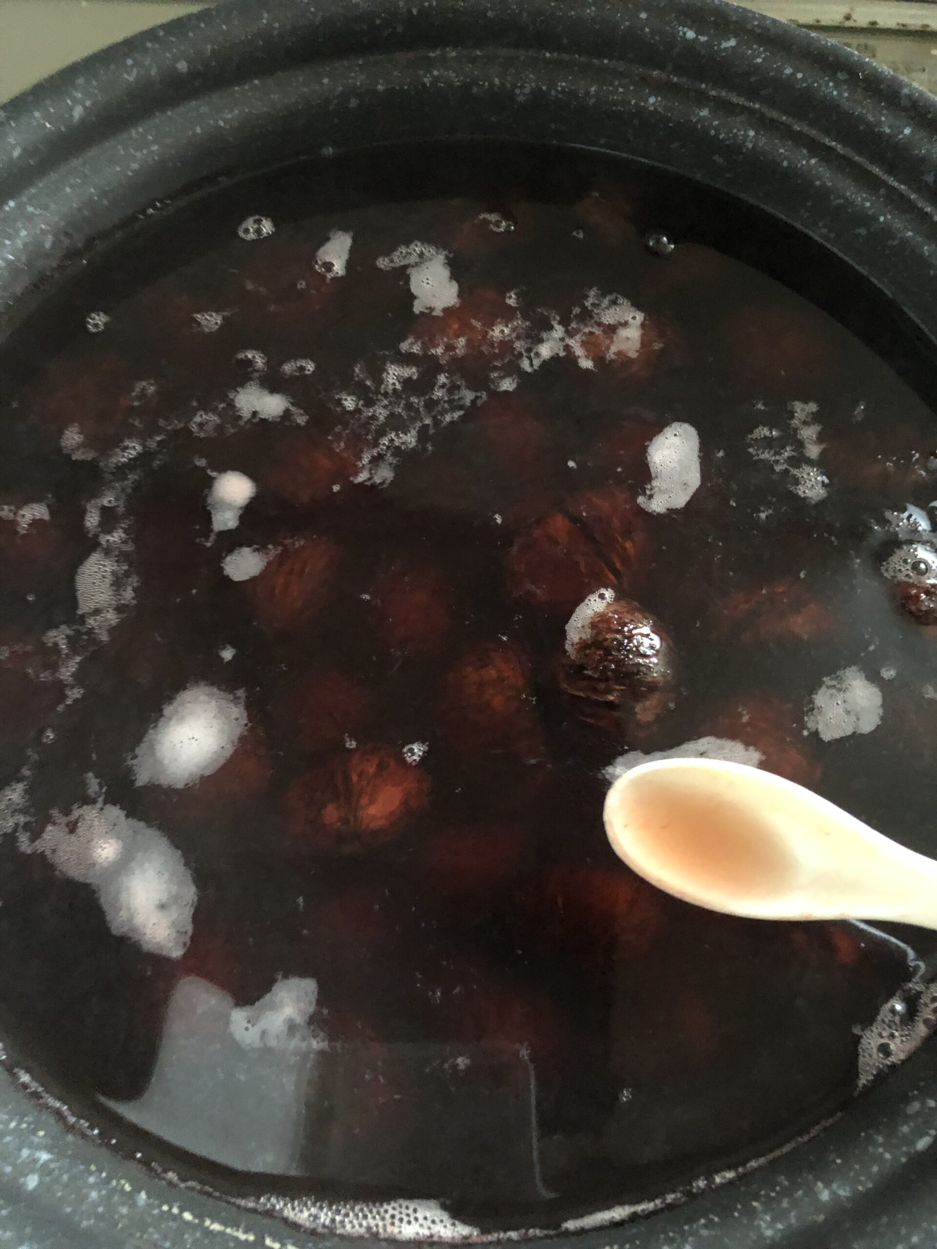 煮汁が澄んだワイン色になるくらいを目安にアク抜きをしていきました。