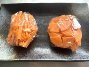 カットしたにんじんも同じように、ラップでぴったりと包みます。