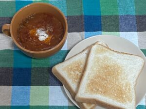 お皿によそったミート”かもしれない”ソースをこんがりトーストしたパンに付けて食べる‥超簡単な軽食にみんなドハマりしておりました♪