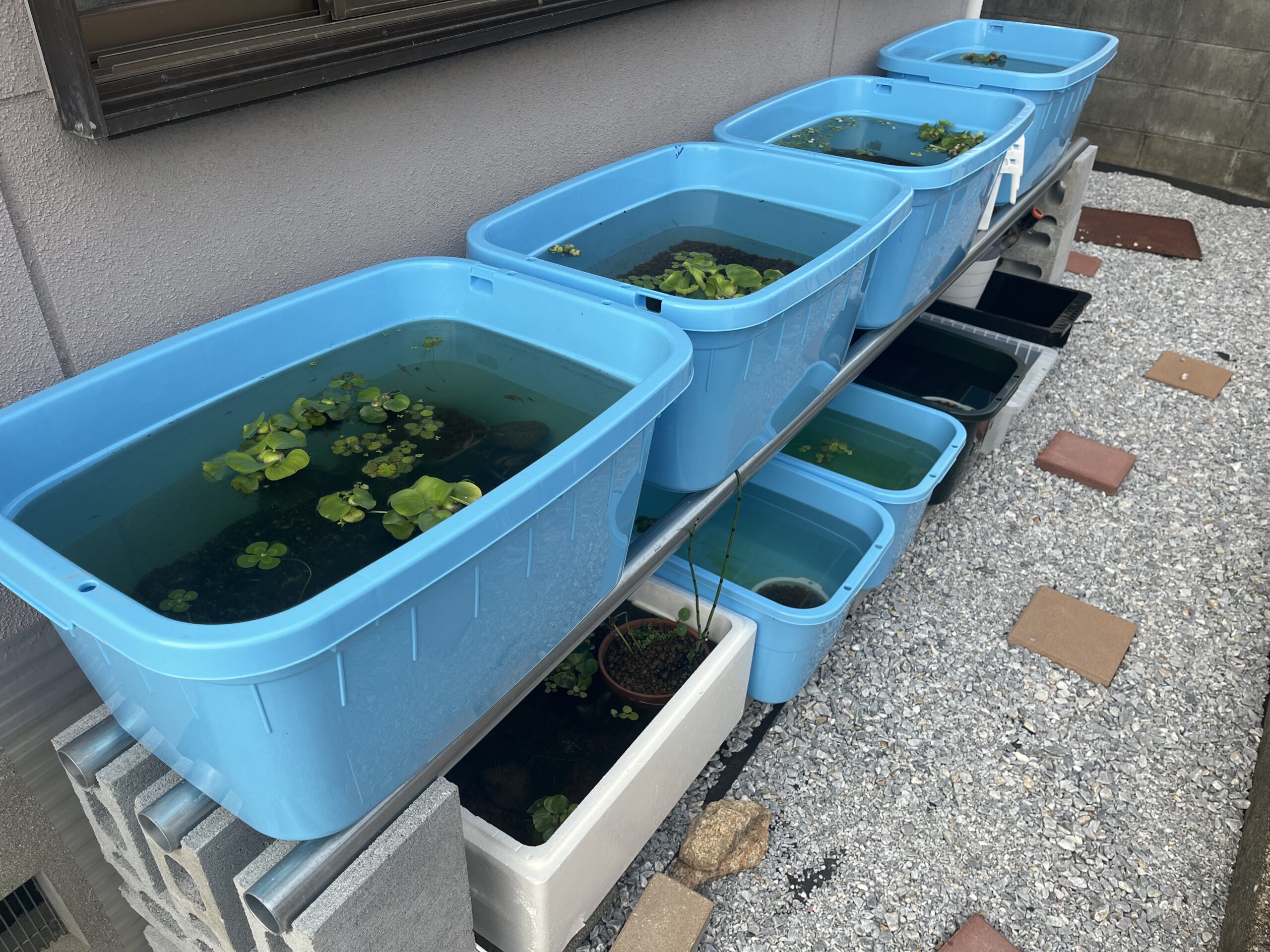 町内の草刈り中に見つけたカメから始まり、知り合いやお客さまからいただいたメダカなどなど‥