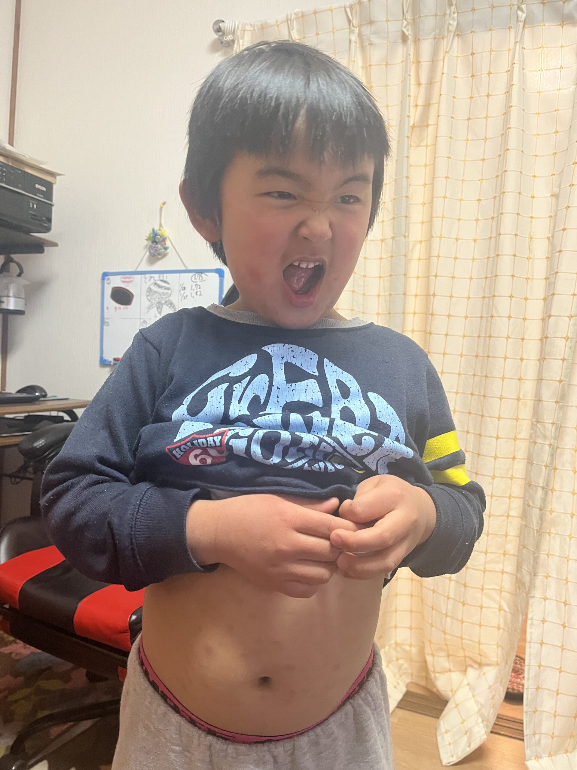 写真を見てもらったらわかるように、次男は肉とよ家のなかでも随一のムードメーカーといっていいほどのお調子者。