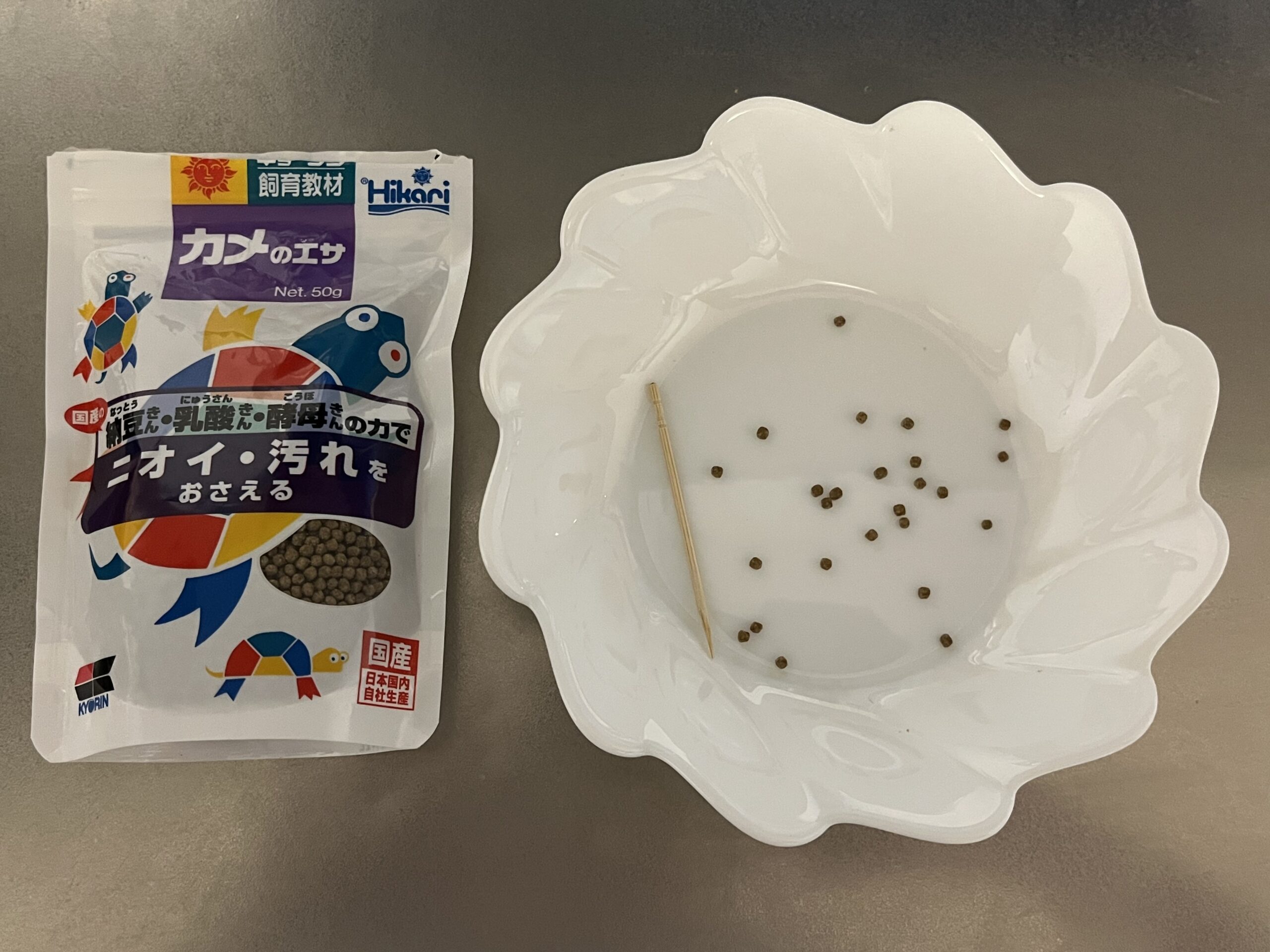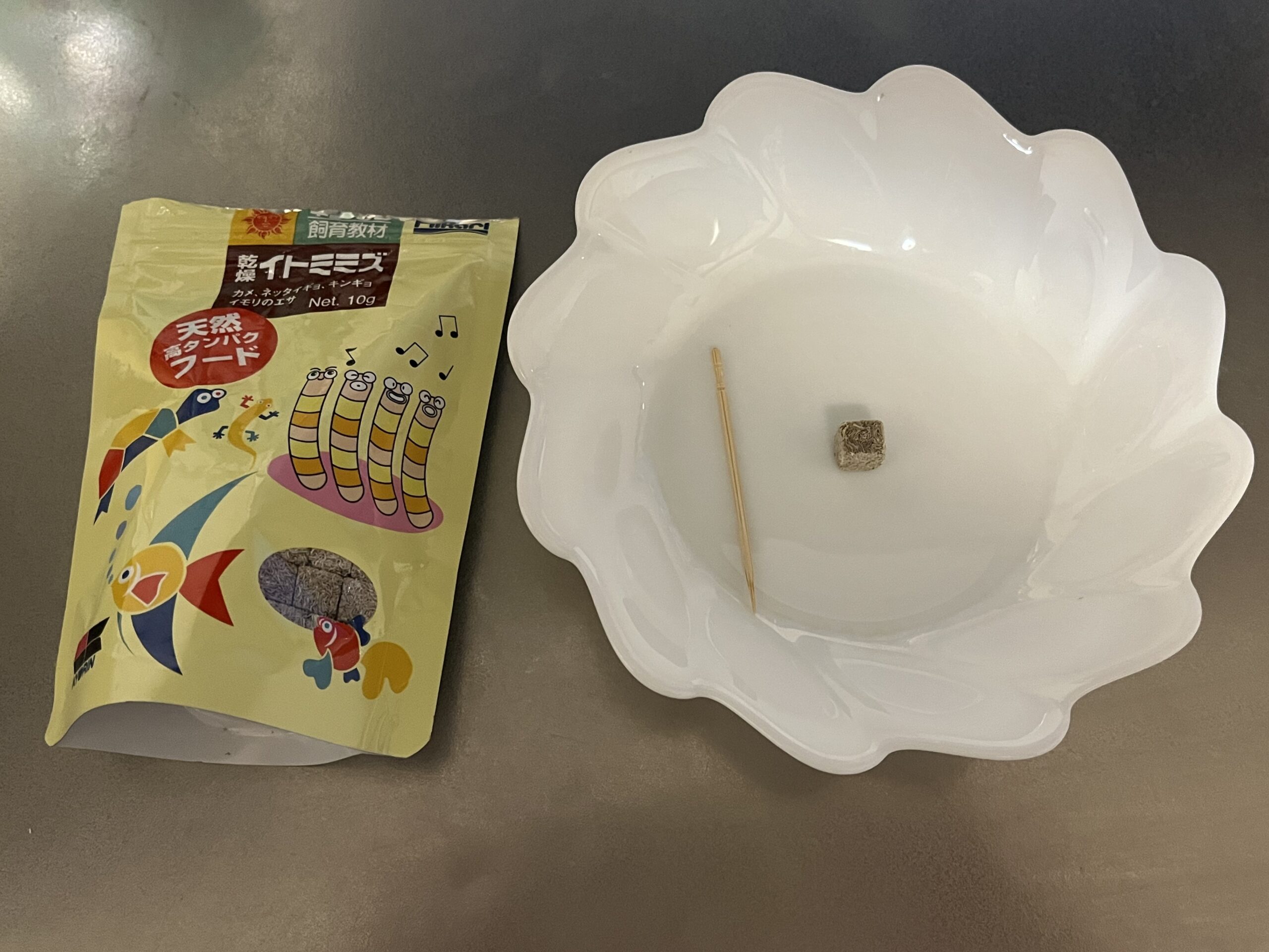 まずは待ちきれないオラオラやっひー用のカメのエサをパラパラと20~30粒ほど、そのあと離れたところでマイペースかっぺぇ用のイトミミズブロックを一口サイズにちぎりながらあげます。