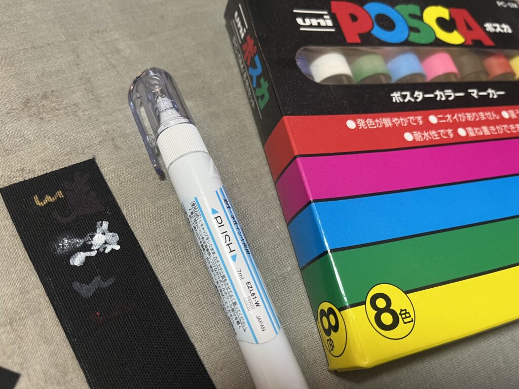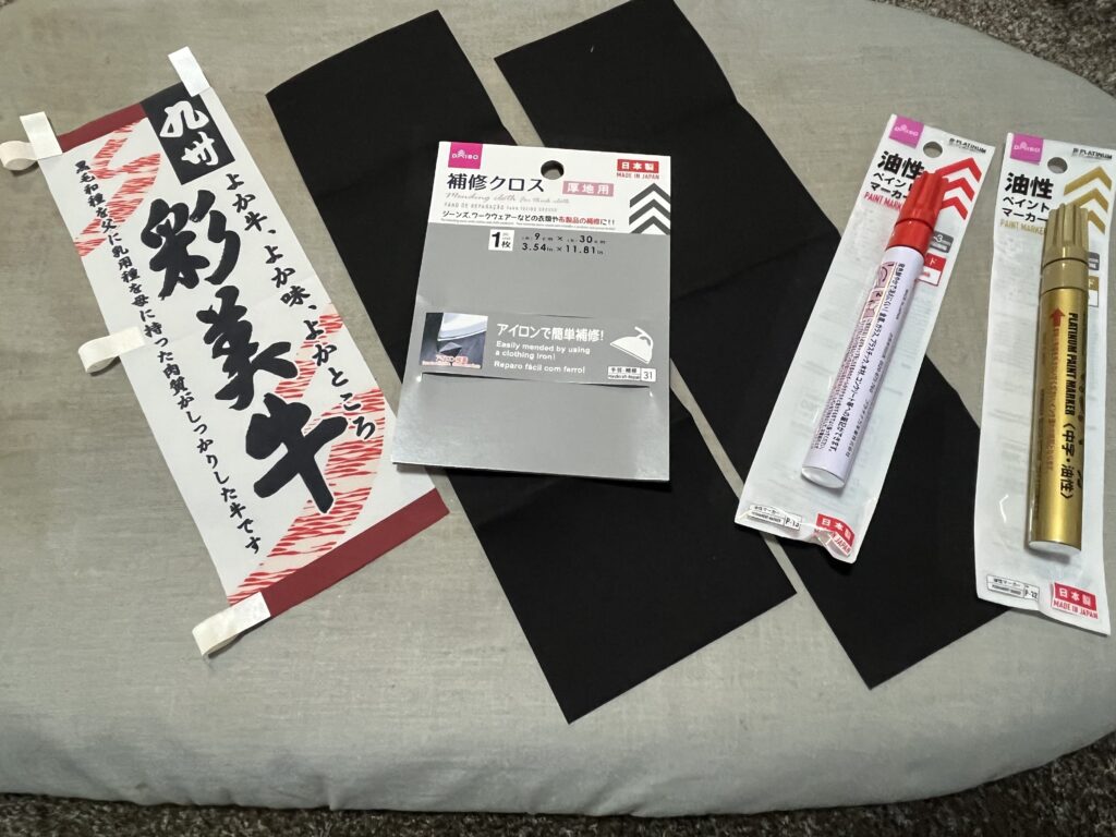 小さなのぼりの大きさに合ったちょうど良さげな補修クロスと、書き込む文字用にペイントマーカーを購入しました。