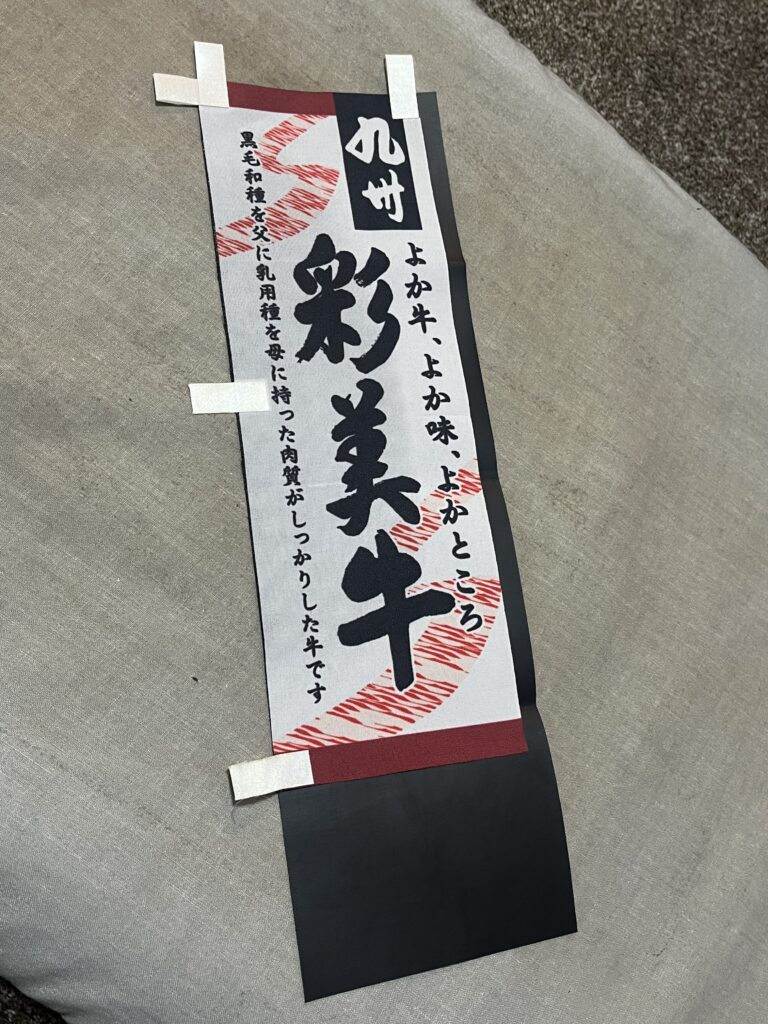 見本である店頭のぼりは白基調でしたが、「肉=赤,もしくは黒」とイメージカラーがあるらしく、目立つように敢えての黒生地を選んでみました。