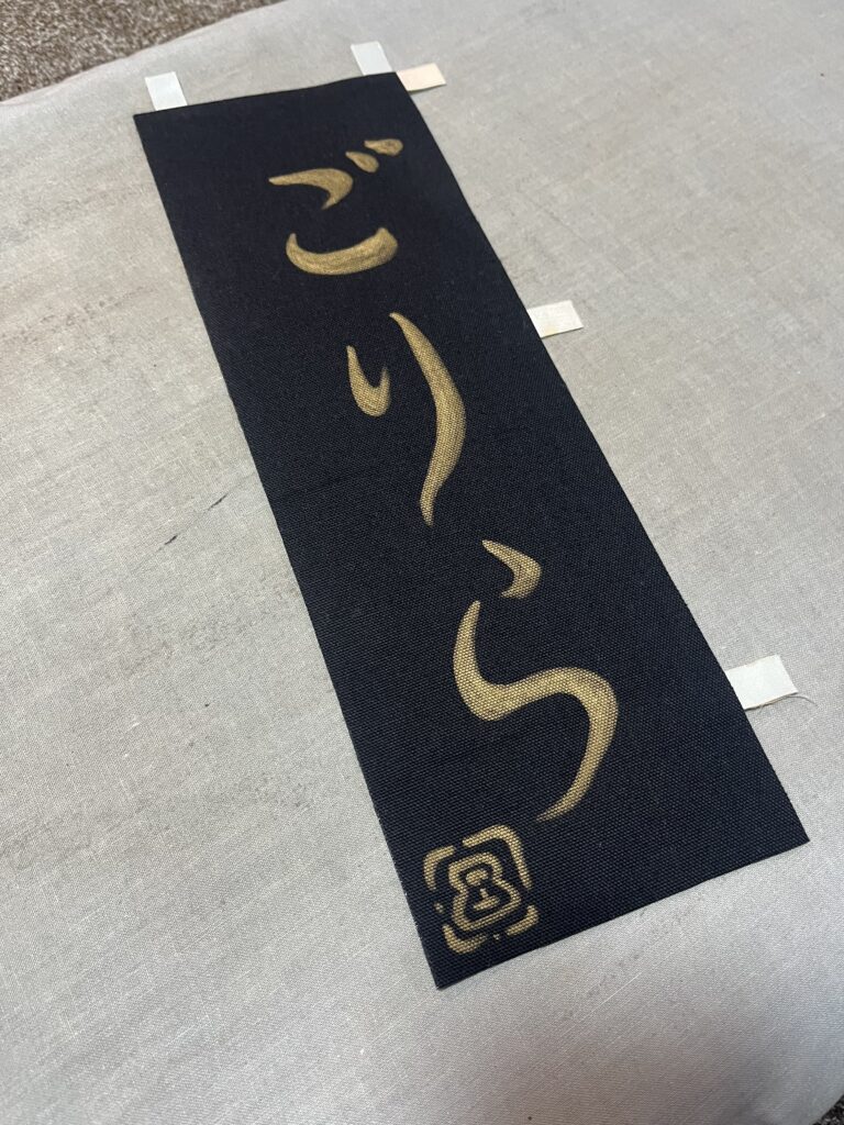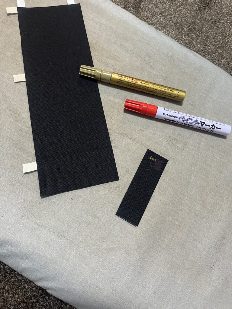 黒生地に金ペンはしっかりと映えるのですが、赤ペンは生地に吸収されてしまうのです。