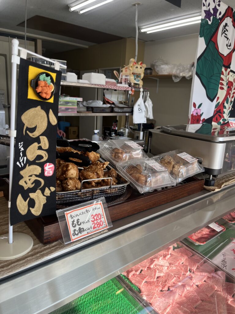 肉とよ内でからあげが置いてある場所はお肉が並んだ対面販売用ケース上部で、量り売りをする際に使用する計量器の横です。