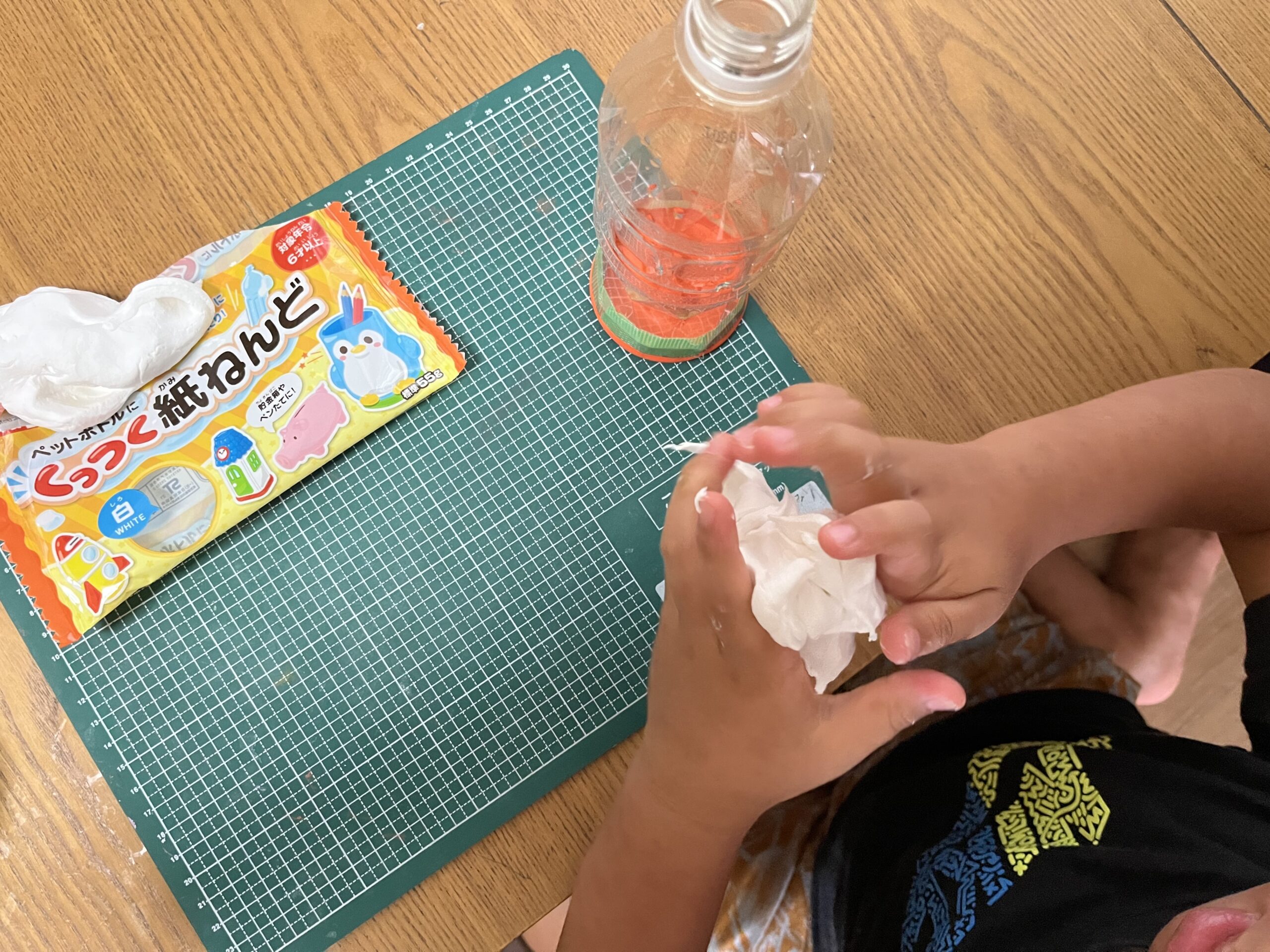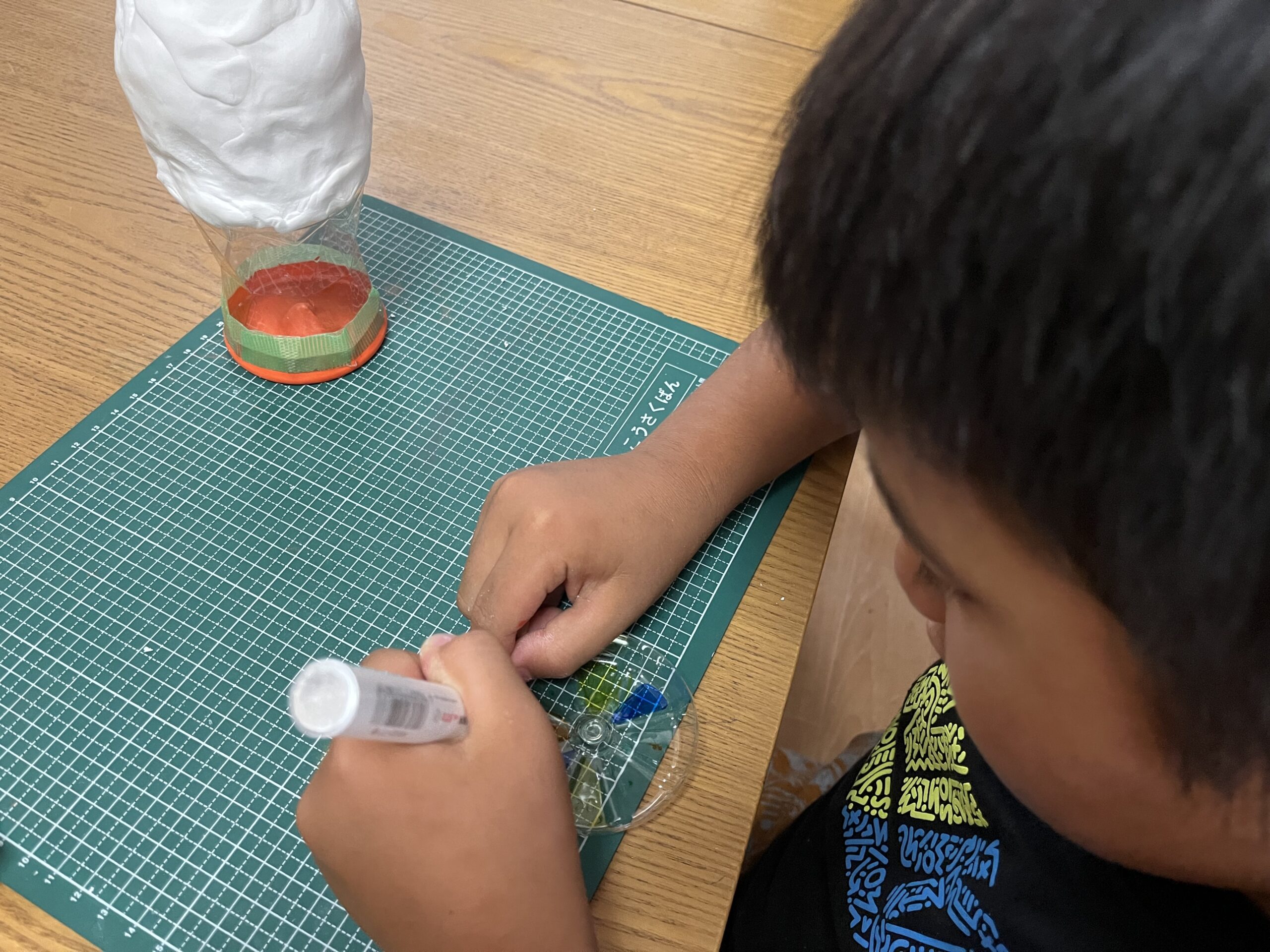 ペットボトルの凹んでいる部分は空気砲を打つ際に手で持つ=力が加わるところなので、あえて紙粘土はまとわせず。