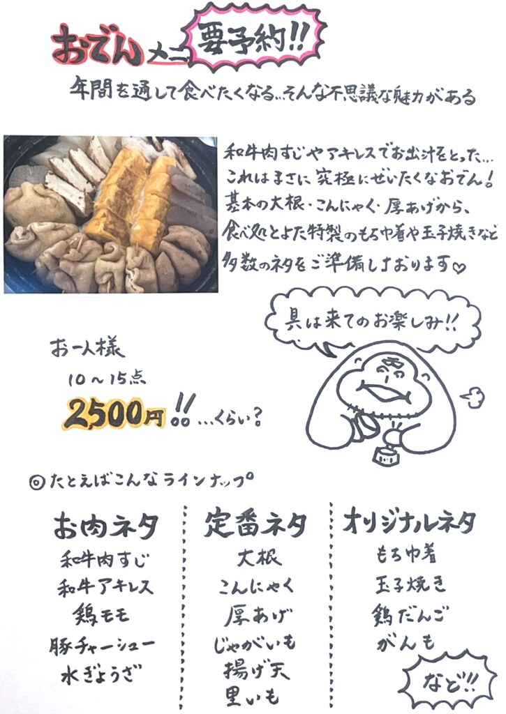 大根・こんにゃく・厚揚げなどの定番に、精肉店ならではの牛すじ・アキレスや、とよた家直伝の手作りモチ巾着などなど‥