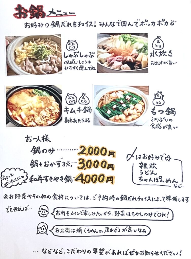 昆布出汁のしゃぶしゃぶ、鶏ガラを煮込んだ水炊き、オリジナルブレンドのキムチ鍋・もつ鍋・すき焼き‥
