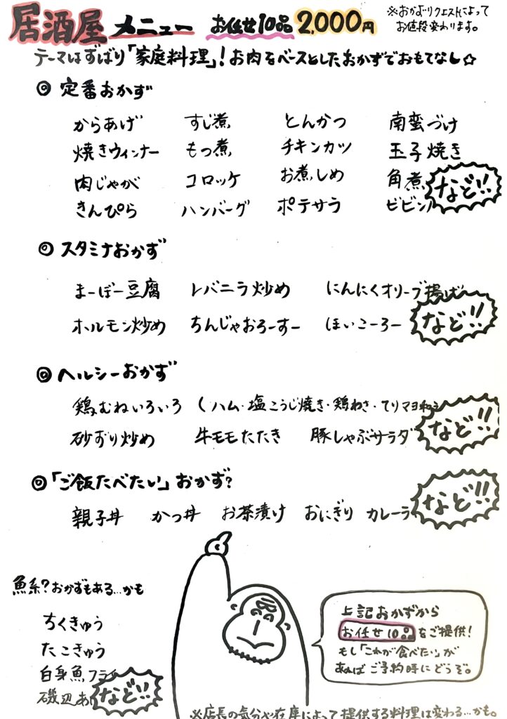 お肉を中心とした家庭料理を8~10品、お一人様2,000円~で提供します。